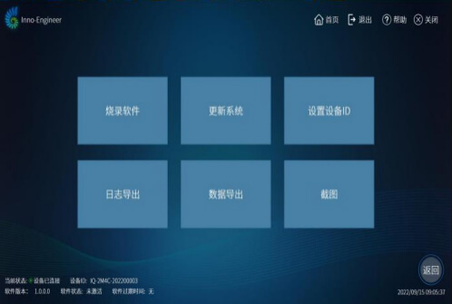 鹦鹉螺工具软件共有六大模块分别为:软件烧录、系统更新、设置设备ID、日志导出、数据导出、截图等。该工具软件主要应用对象为实时荧光定量PCR仪(Inno-Quick-2M4C),方便生产烧录等工作的进行。